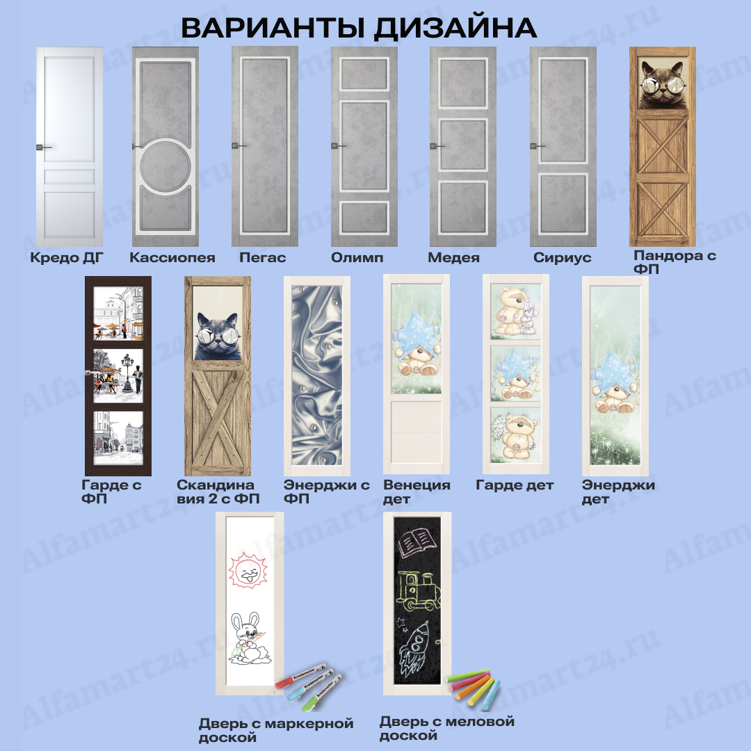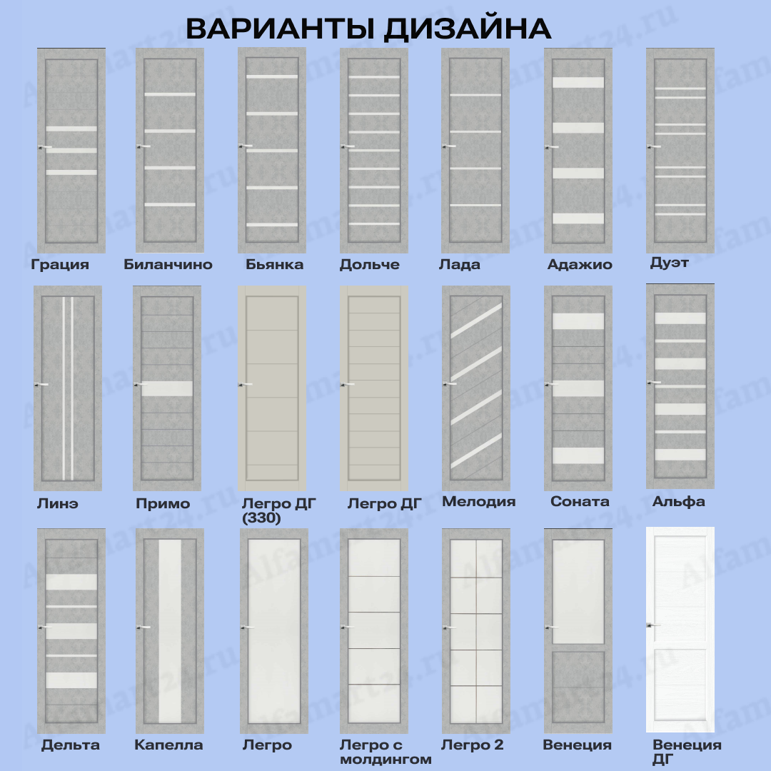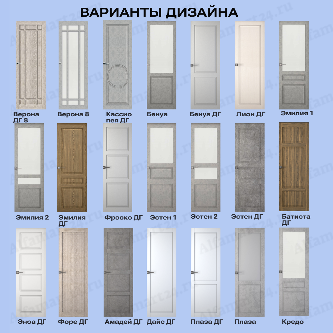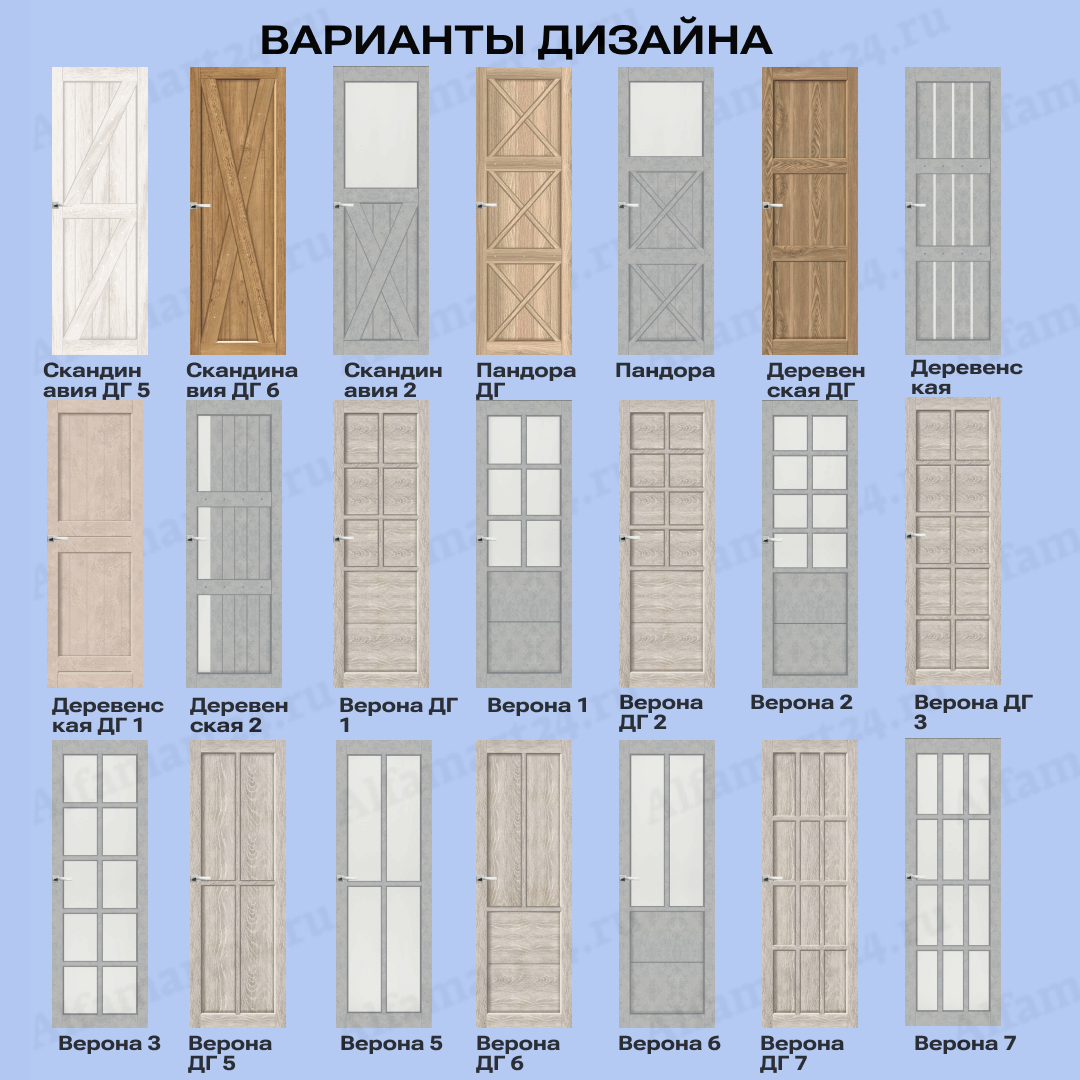 Двери возможно изготовить в большом разнообразии дизайнов. Популярными дизайнами являются двери с большим количеством стекла, либо со стеклом в половину или стеклом решеткой. Стоит обратит внимание на варианты дверей без стекла и с молдингом. Любой из перечисленных вариантов можно подобрать, посчитать и согласовать с нашими менежерами.