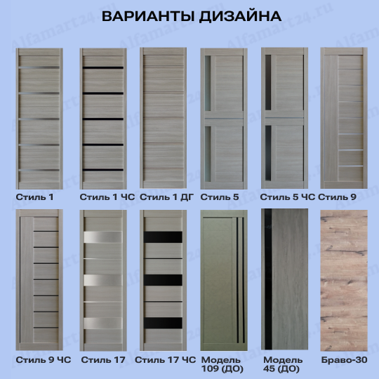 Двери возможно изготовить в большом разнообразии дизайнов. Популярными дизайнами являются двери с большим количеством стекла, либо со стеклом в половину или стеклом решеткой. Стоит обратит внимание на варианты дверей без стекла и с молдингом. Любой из перечисленных вариантов можно подобрать, посчитать и согласовать с нашими менежерами.