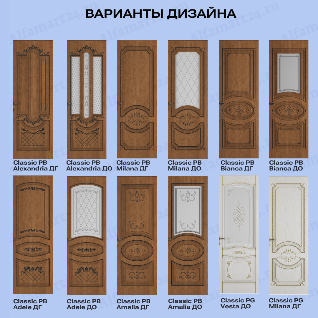 Двери возможно изготовить в большом разнообразии дизайнов. Популярными дизайнами являются двери с большим количеством стекла, либо со стеклом в половину или стеклом решеткой. Стоит обратит внимание на варианты дверей без стекла и с молдингом. Любой из перечисленных вариантов можно подобрать, посчитать и согласовать с нашими менежерами.