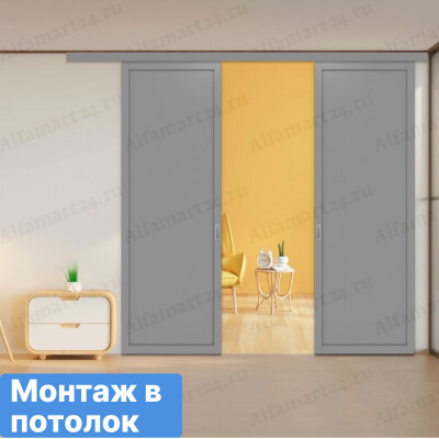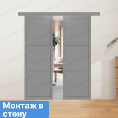 Межкомнатная перегородка Optima Porte двухстворчатая купе остекленная вне проема Турин 130.222 (Серый / Сатин)