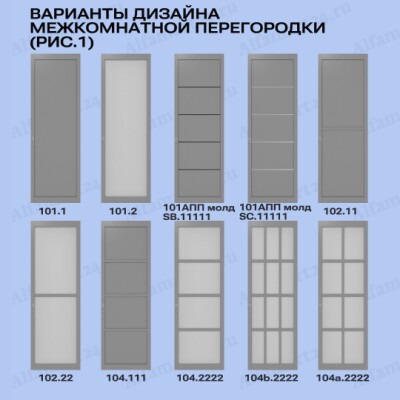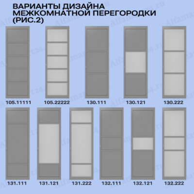 Данную перегородку возможно изготовить в более чем 20 вариантах дизайна. Популярными дизайнами являются перегородки с большим количеством стекла, либо со стеклом в половину или стеклом решеткой. Стоит обратит внимание на варианты перегородок без стекла и с молдингом. Любой из перечисленных вариантов можно подобрать, посчитать и согласовать с нашими менежерами.